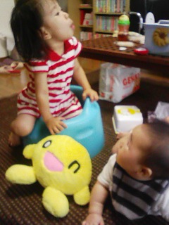 「おかあさんといっしょ」を見ながら踊るお姉ちゃんを オウはじぃっと見上げていました。 学習しているに違いない・・・。 ずりばいの姿勢で見上げるため、 どうしてもスカートのひらひらが気になるらしく すると今度はめくってみたくなるようで。 めくったら「ヤッ!!」て言われていましたー。 ふられてやんの。